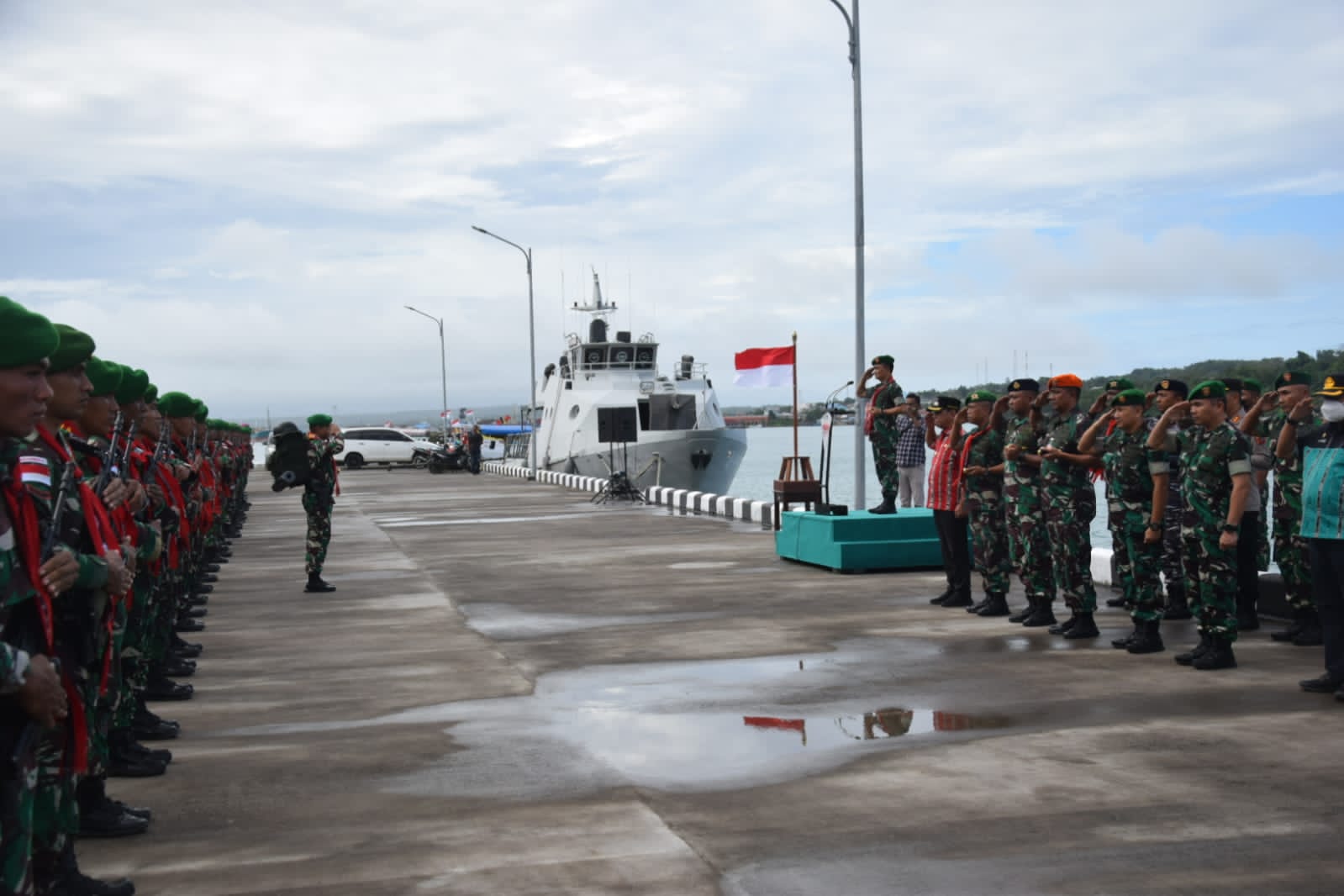 AMBON,N25NEWS.id-Komandan Komando Pelaksana Operasi (Dankolakops) Korem 151/Binaiya, Brigjen TNI Maulana Ridwan, S.H., M.H. pimpin Upacara Pemberangkatan Satuan Tugas Operasi Pengamanan Pulau-pulau terluar (Satgas Pamputer) Kodam XVI/Pattimura yang berlangsung di Dermaga Pangkalan TNI AL (Lanal) Saumlaki di Kabupaten Kepulauan Tanimbar, Kamis (30/6/2022).