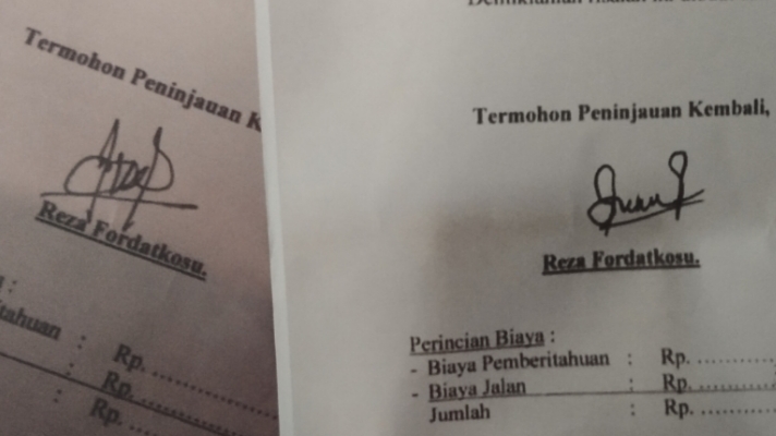 Dia melanjutkan, saat melihat risalah panggilan sidang PK tersebut,dirinya kaget, mengapa tanda tangannya dipalsukan, dan kalau ada yang memalsukan siapa kira-kira yang memalsukannya.