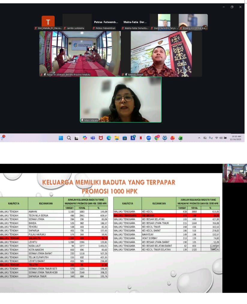 AMBON,N25NEWS.id – Perwakilan BKKBN Provinsi Maluku menggelar pertemuan monitoring dan evaluasi (Monev) capaian Program Ketahanan Keluarga dan Pencegahan Stunting (KKPS) secara daring melalui Zoom Meeting.