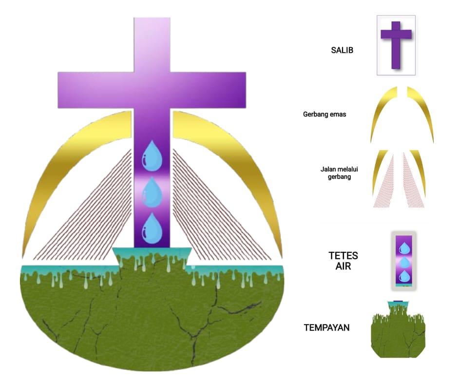 Kemudian, lanjut Ronald, tiga buah tetes air yang turun menuju tempayan melambangkan anugerah Allah yang tidak pernah berhenti memenuhi, dan melengkapi gereja sepanjang masa.