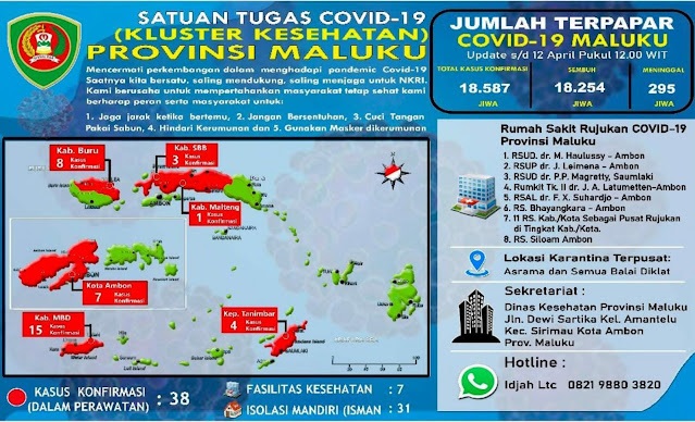 Kasus terkonfirmasi Covid-19 di Maluku sebanyak 38 kasus yang berasal dari, Kota Ambon 7 kasus, Kabupaten Buru 8 kasus, Kabupaten Seram Bagian Barat (SBB) 3 kasus Kabupaten Maluku Barat Daya (MBD) 15 kasus dan Kabupaten Kepulauan Tanimbar 4 kasus.