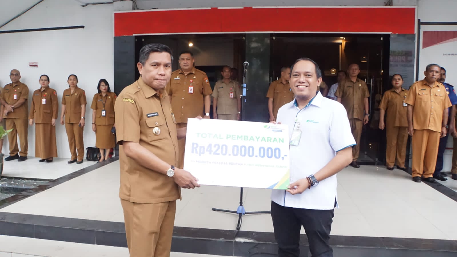Penyerahan secara simbolis diserahkan langsung oleh Pejabat Walikota Ambon Bodewin Wattimena disaksikan Kepala BPJS Ketenagakerjaan Dwi Ari Wibowo.