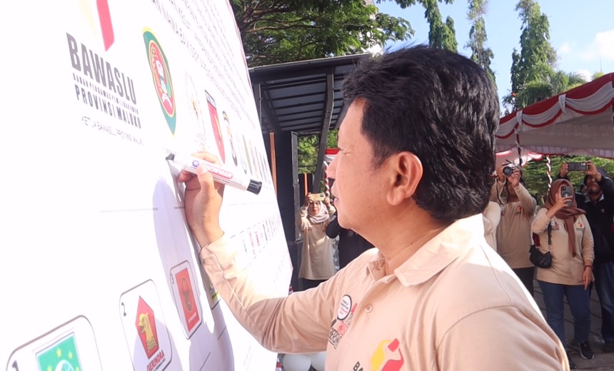 AMBON-Sekretaris Daerah Maluku Ir. Sadali Ie, M.Si., IPU, ikuti Apel Siaga Deklarasi Kampanye Damai di bawah sorotan tema “Baku Kele Awasi Vor Biking Bae Pemilu Serentar 2024”, dengan tagline Bersama Rakyat Awasi Pemilu Bersama Bawaslu Tegakkan Keadilan Pemilu, pada Kamis (23/11/2023), bertempat di Taman Pattimura Ambon.