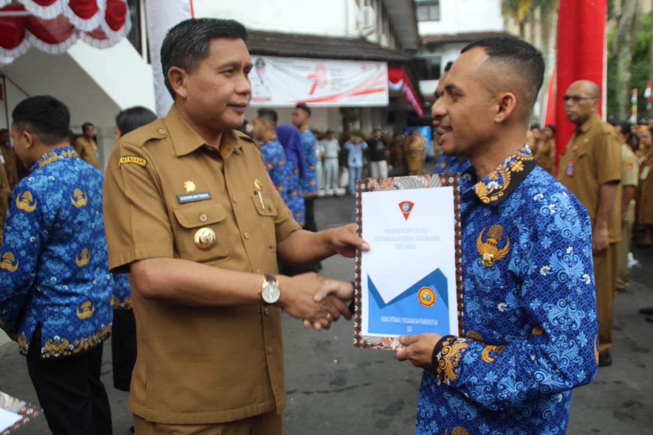 AMBON,N25NEWS.id,-Pejabat Walikota Ambon, Bodewin Wattimena menyerahkan surat keputusan (SK) Pegawai Pemerintah dengan Perjanjian Kerja (PPPK) kepada 302 guru, yang berlangsung di Halaman Parkir Balaikota Ambon, Senin (28/8/2023).