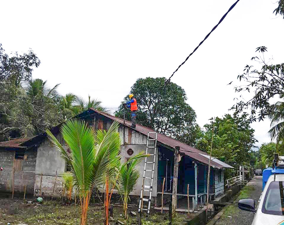 Tim teknik dari PLN ULP Piru merespons permintaan masyarakat untuk mengamankan kabel sambungan rumah (SR) yang melintas di atas bangunan tua milik keluarga Kapitan, yang sudah tidak dihuni namun masih menjadi jalur sambungan bagi tiga pelanggan aktif.