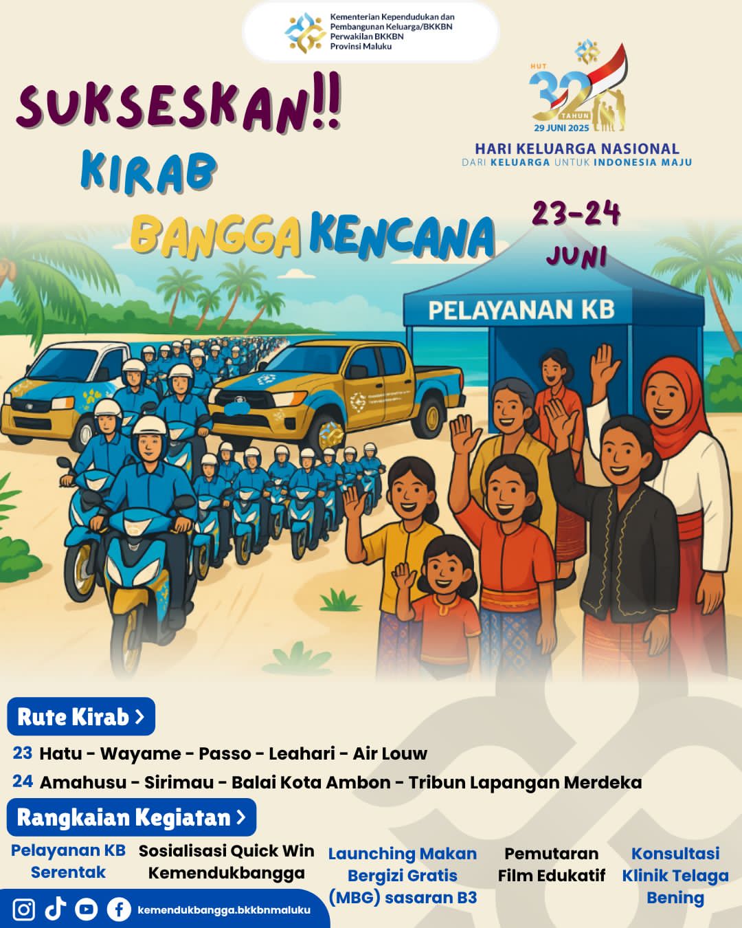 Kirab akan berlangsung selama dua hari, pada 23–24 Juni 2025. Untuk pelayanan KB pada 23 Juni digelar di Balai Penyuluhan KB Desa Hatu (Kecamatan Leihitu Barat), Balai Penyuluhan KB Desa Wayame (Kecamatan Teluk Ambon), Kantor Camat Baguala (Desa Passo), dan Kantor Camat Leitimur Selatan (Desa Lehari).
