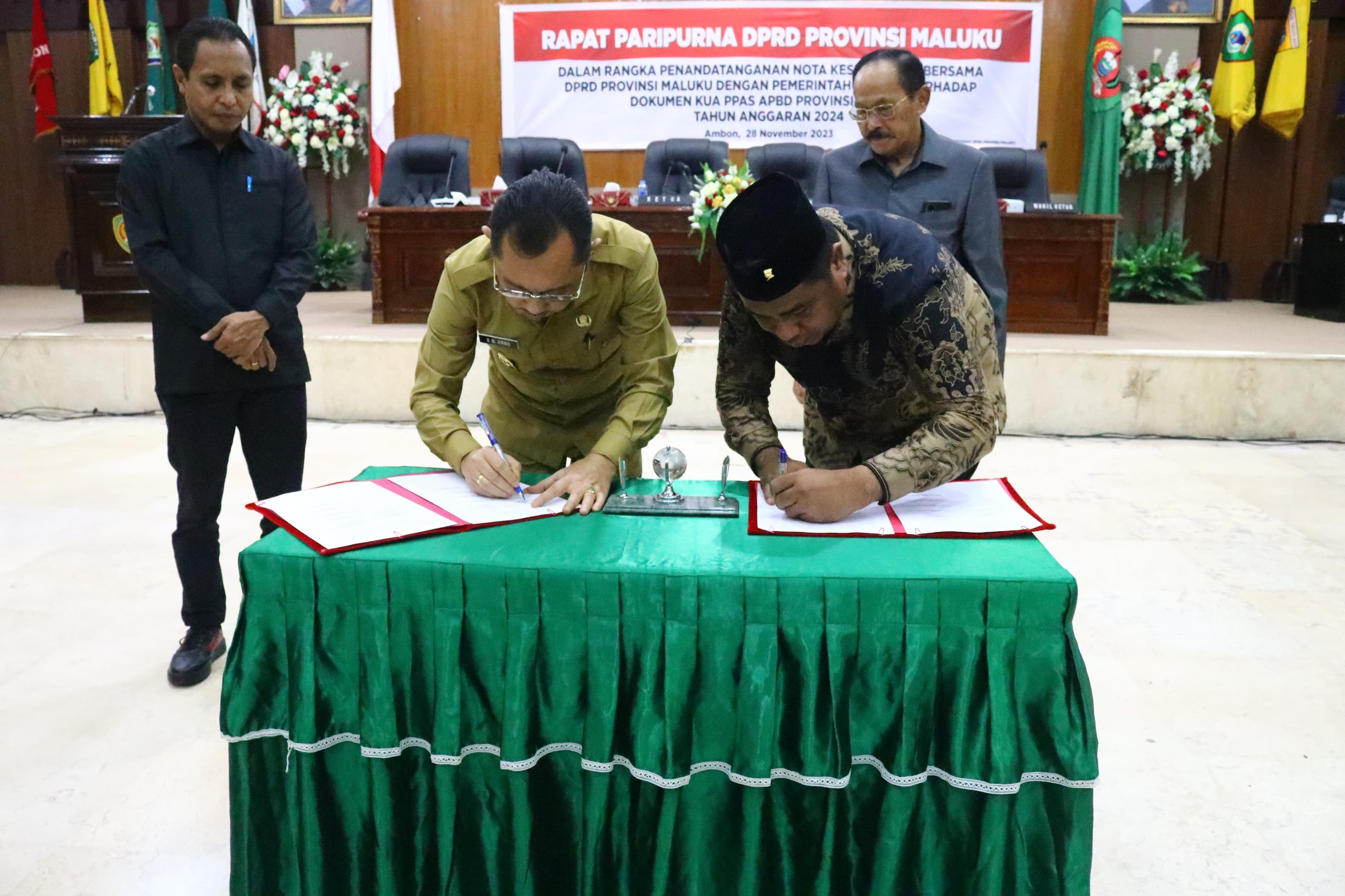 Setelah itu Wakil Gubernur dengan Ketua serta para wakil DPRD menandatangani nota kesepakatan KUA PPAS APBD 2024, yang dilanjutkan dengan agenda Penyampaian Nota Keuangan dan Rancangan Peraturan Daerah tentang Anggaran Pendapatan dan Belanja Daerah (APBD) Provinsi Maluku Tahun Anggaran 2024.