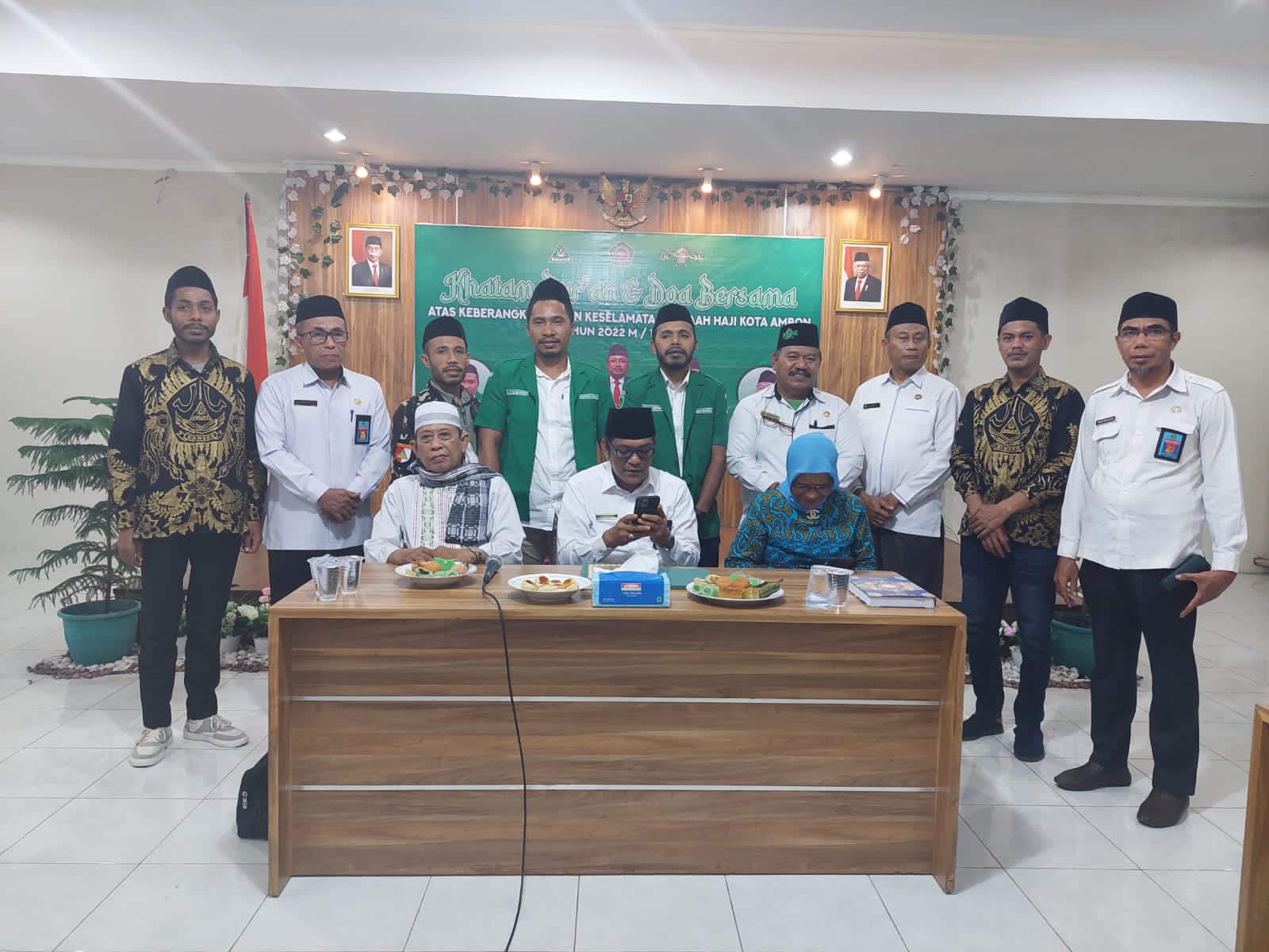 Doa bersama yang dirangkaikan dengan khatam Al Quran dipimpin Al Ustad Nazarudin Fatoni, bertempat di Aula Kemenag Kota Ambon, Selasa(21/6) yang dilanjutkan dengan Tausiyah, turut dihadiri GP Ansor Ambon, NU, Fatayat dan muslimat, serta sejumlah pejabat muslim eslon IV lingkup Kemenag Ambon.