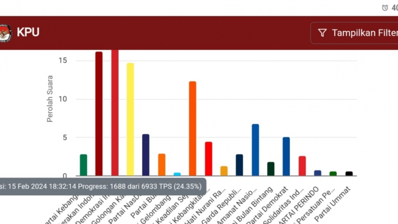 Hingga Senin (19/2/2024) data KPU per 06.18 WIB menunjukkan sudah terkumpul 55,95 persen suara dari seluruh Tempat Pemungutan Suara (TPS). Dari 18 parpol nasional, 9 diantaranya sudah mencapai ambang batas parlemen sebesar 4 persen, dengan partai Partai Demokrasi Indonesia Perjuangan (PDIP) unggul di perhitungan asli data TPS atau real count.